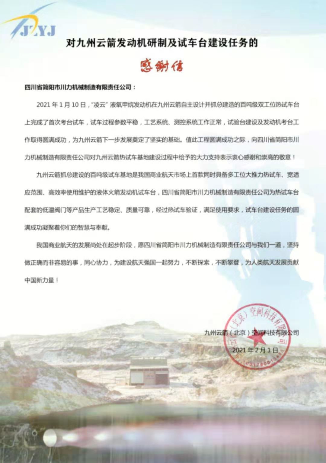 九洲云箭首次考台试车圆满成功来函表示感谢
